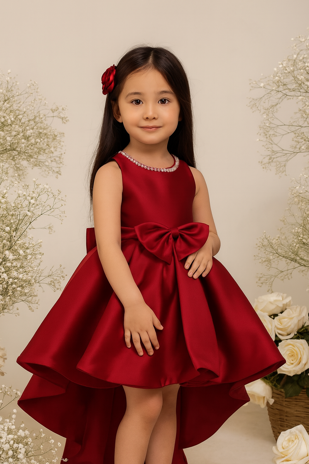 The Bree Luxe Bow Dress is one of our best-selling flower girl dresses, loved for its timeless charm and luxurious silhouette. Crafted from premium satin with a graceful sheen, it features a classic sleeveless bodice, a delicately hand-embellished pearl neckline, and a voluminous high-low skirt that moves beautifully with every step. The statement satin bow at the waist adds a perfect touch of elegance β making it an unforgettable choice for weddings, birthdays, and formal occasions.