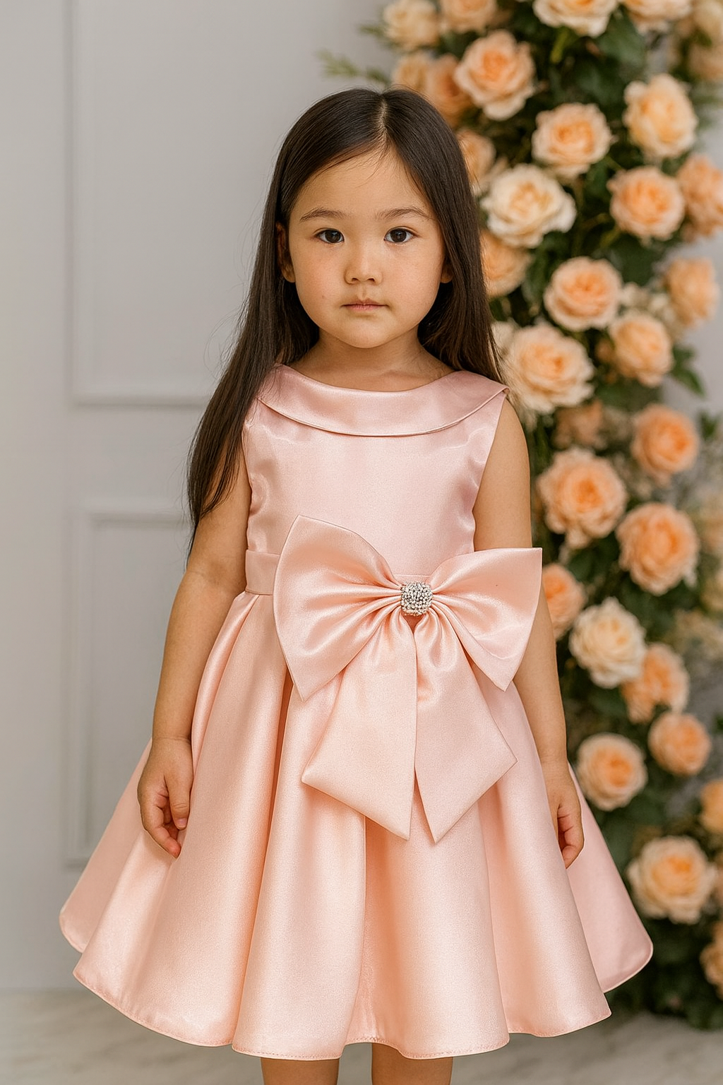 The Sophie Luxe Bow captures effortless elegance in every detail. Crafted from premium satin with a refined sheen, it features a classic boat neckline, a full twirl-worthy skirt, and a grand bow accent at the waist embellished with a pearl cluster. Designed for grace and comfort, this dress is perfect for weddings, birthdays, and all special celebrations.