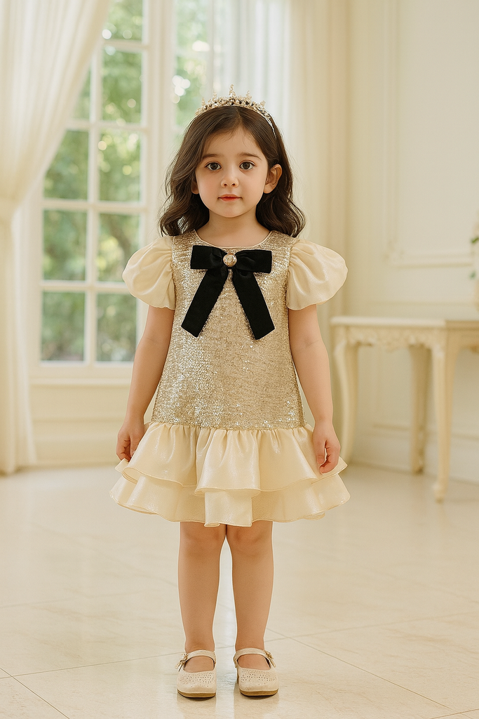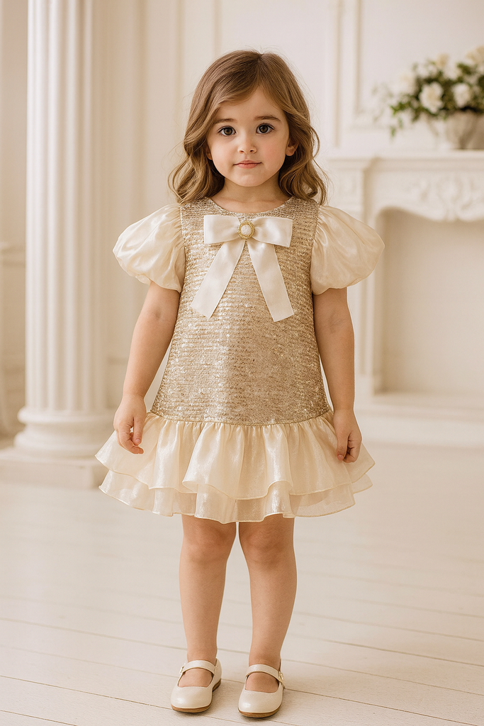The Alessia Lumière Ruffle Dress- Beige is made for little girls who love to shine. Designed with a glimmering sequin bodice, puffed sleeves, and a dreamy layered ruffle hem — it’s the perfect mix of sparkle and sweetness. The soft inner lining ensures comfort while keeping that luxurious, polished look Lassie & Laddie is known for.