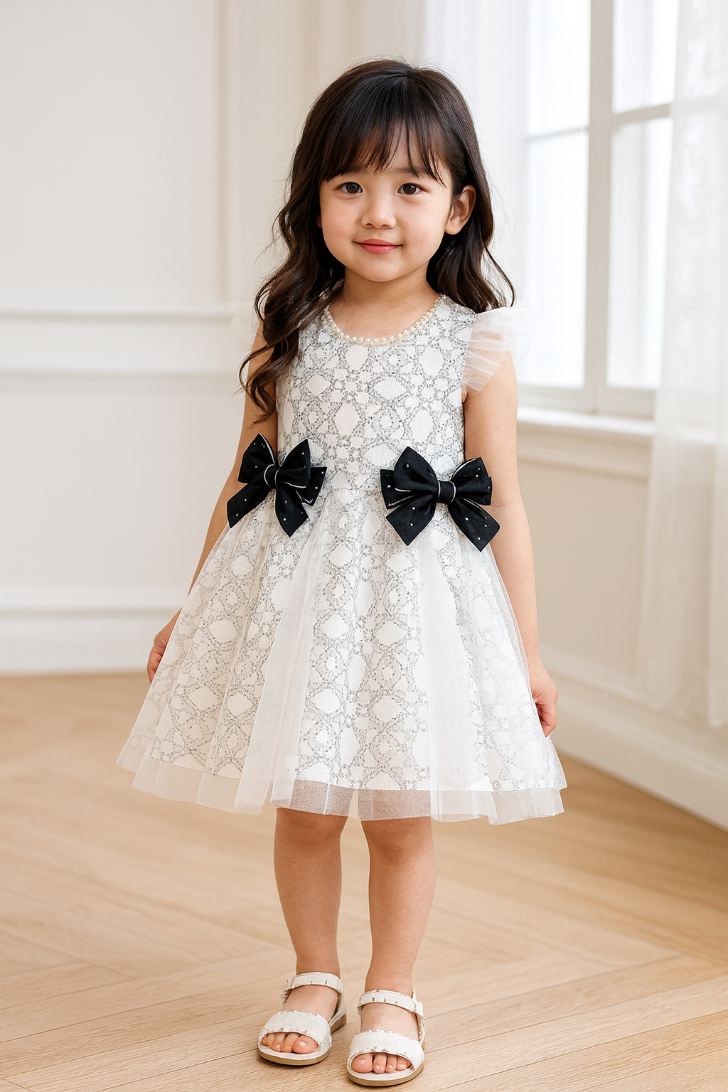 A chic black-and-white dress featuring a soft lace overlay and alternating tulle panels for a modern, stylish look. Designed with flutter tulle sleeves, a statement black flower accent, and a lightweight, flowy silhouette perfect for everyday wear with a touch of elegance.