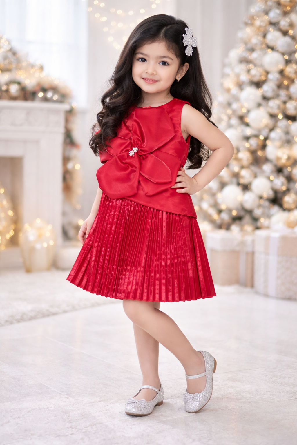 This luxurious pleated satin flower dress exudes elegance and charm, perfect for little ones who deserve to look their best for any special occasion. Featuring a delicate, oversized bow at the waist with pearl accents, this dress has a unique shine that will capture everyone’s attention. The pleated satin skirt adds dimension and movement, making it a perfect twirl-worthy outfit for parties, photoshoots, or elegant gatherings.