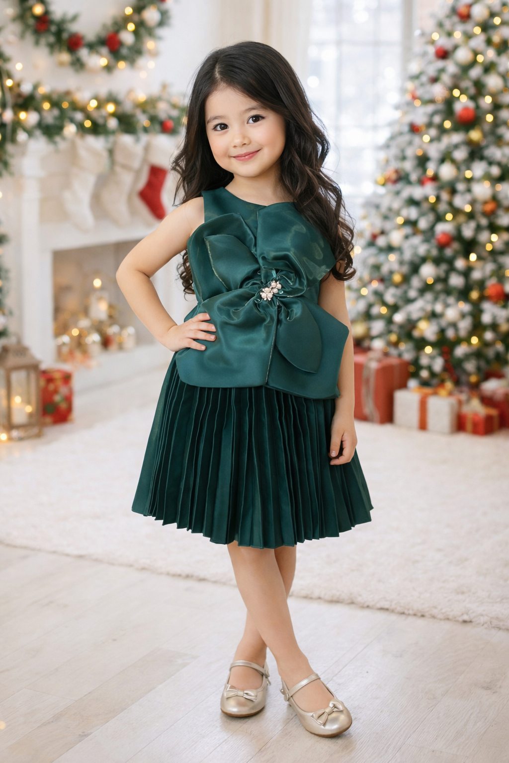 Amara - Emerald Green Dress with Oversized Bow and Pleated Skirt (LL643)