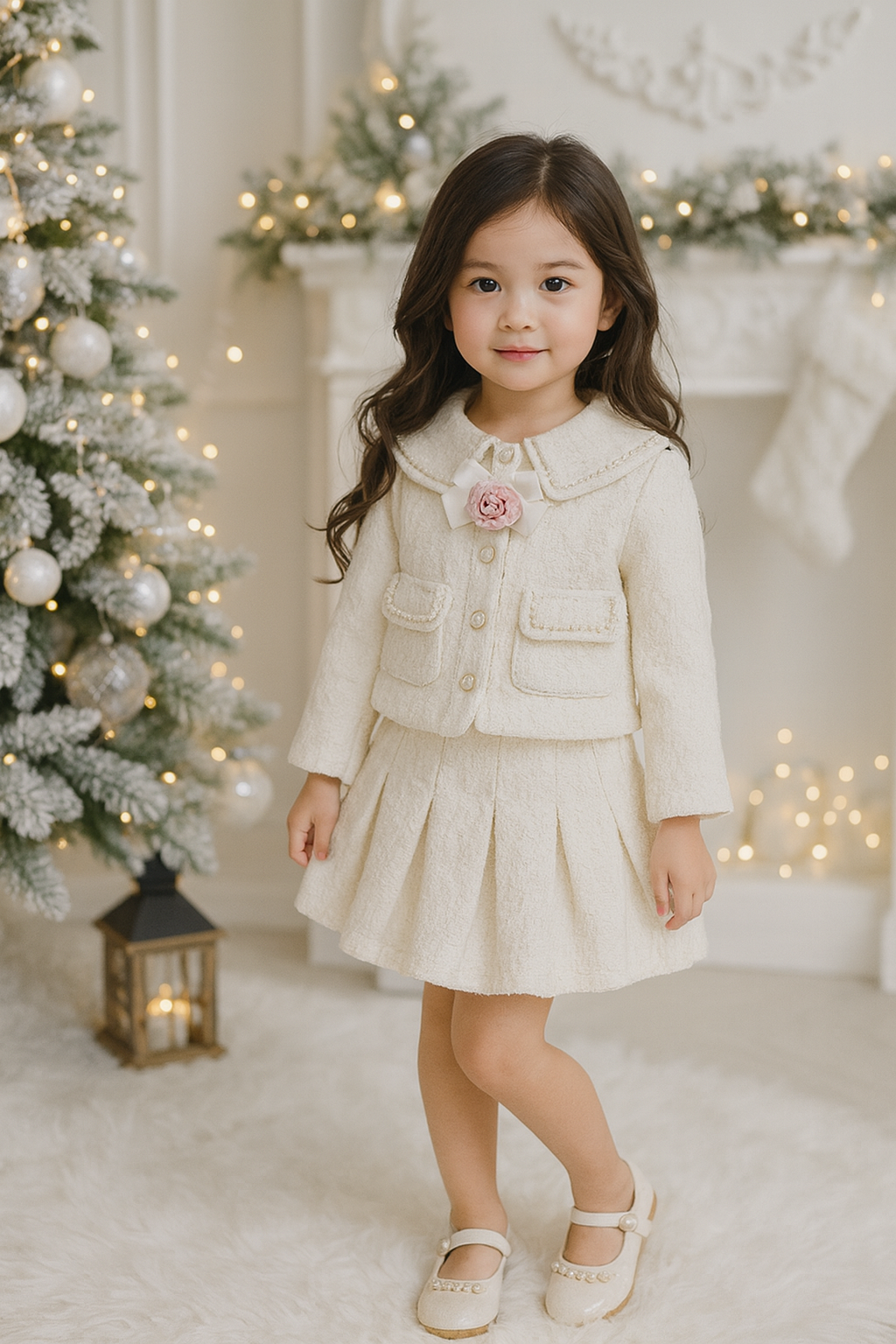 Crafted from premium textured tweed, this set features a cropped jacket-style top with pearl-trim detailing, decorative buttons, and a delicate floral bow accent at the neckline. The matching high-waist pleated skirt completes the look with a soft, graceful silhouette designed for comfort and movement.