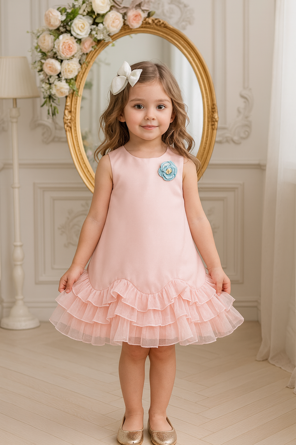 Description: A celebration of modern elegance, the Ava Bloom Dress brings soft sophistication to your little one’s wardrobe. Crafted from smooth satin with a scalloped hem that blooms into layers of sheer organza ruffles, this piece captures a perfect balance of charm and grace.