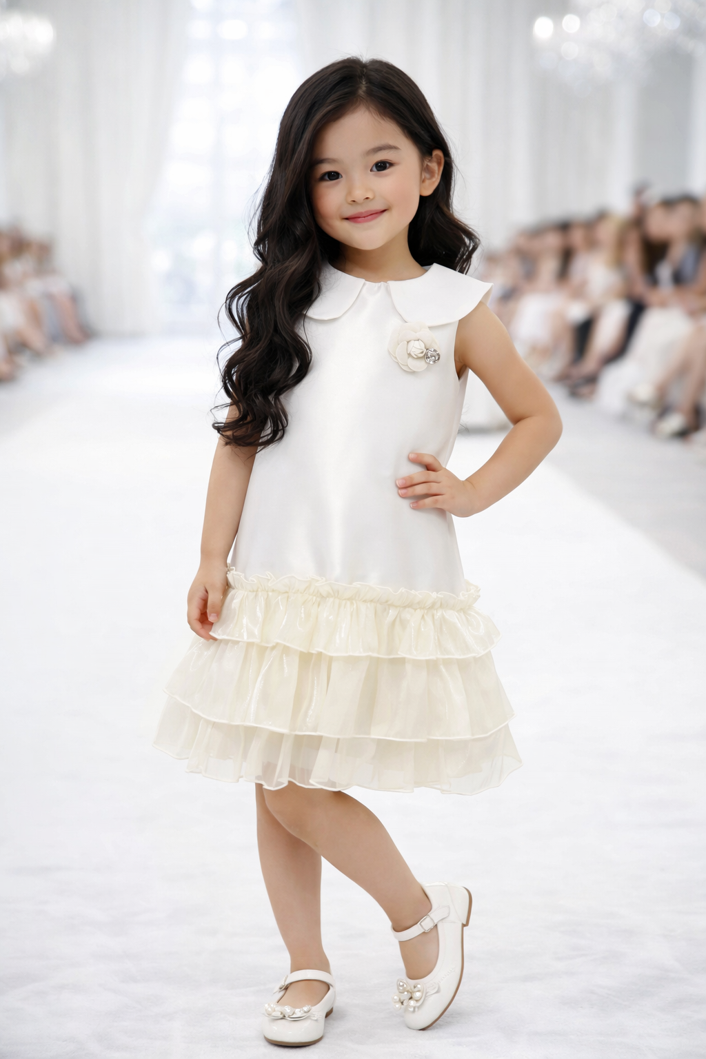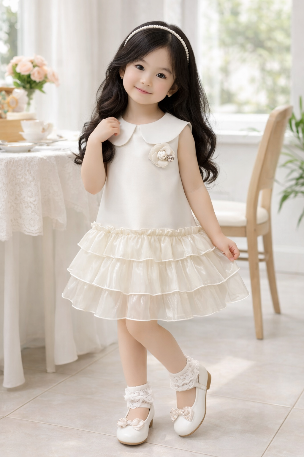 This sleeveless dress features a classic Peter Pan collar, a delicate floral accent on the bodice, and beautifully layered ruffle tiers that add volume and movement with every step. Designed with comfort and elegance in mind, this dress is perfect for both special occasions and refined everyday wear.