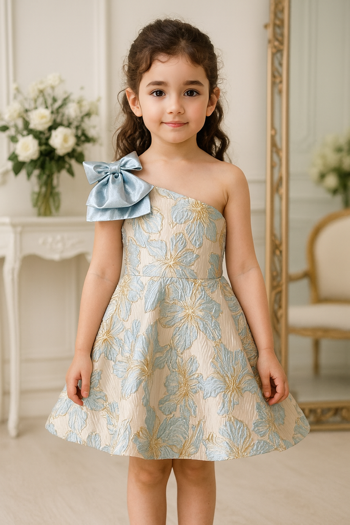 The Lauren Bloom Dress-Powder Blue is an exquisite one-shoulder masterpiece designed for little girls who adore sophistication and charm. Crafted from luxurious floral jacquard fabric with metallic accents, this dress features a statement bow on the shoulder and a flared skirt that moves beautifully with every step. A true show-stopper for any special occasion.