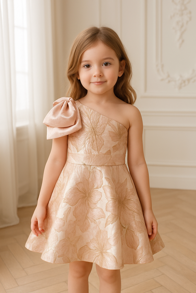 The Lauren Bloom Dress-Blush Pink is an exquisite one-shoulder masterpiece designed for little girls who adore sophistication and charm. Crafted from luxurious floral jacquard fabric with metallic accents, this dress features a statement bow on the shoulder and a flared skirt that moves beautifully with every step. A true show-stopper for any special occasion.